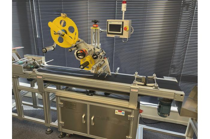Automatic pouch feeding, vacuum conveyor with top apply label applicator.