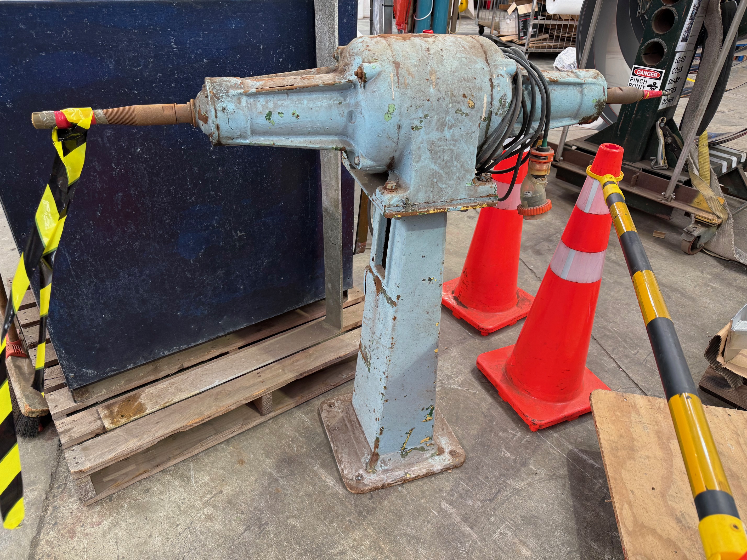 Up for grabs is this absolute beast of a machine, a classic Heavy-Duty Industrial Polishing Machine (Buffer) on a solid pedestal stand.
