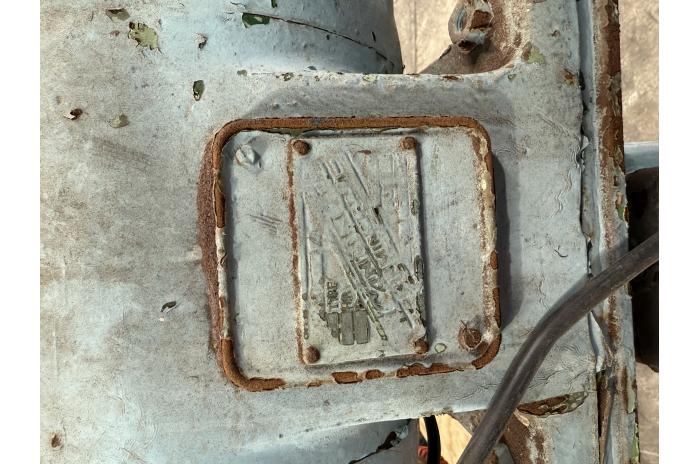 The nameplate is currently obscured by rust (see photo). You may be able to carefully clean the nameplate to reveal the exact Voltage, RPM, and HP details.